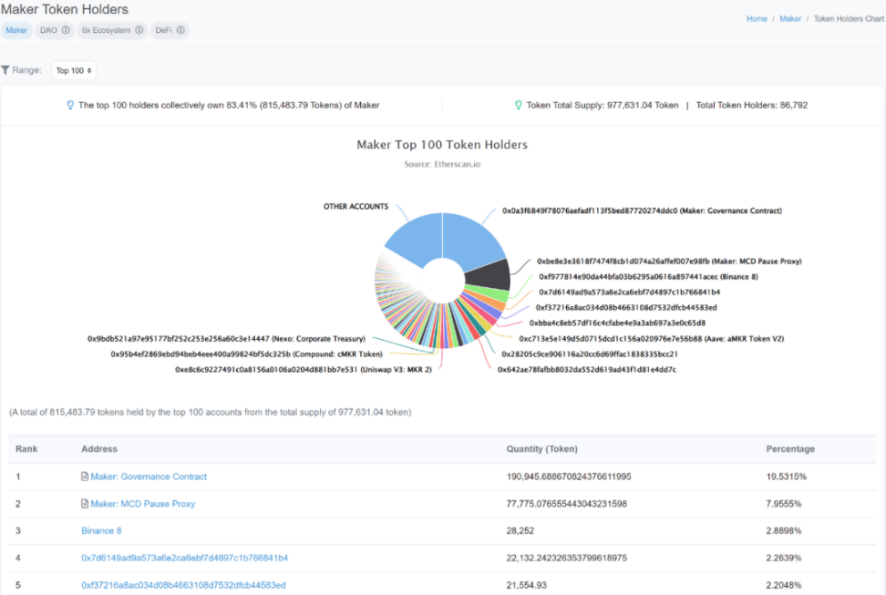 MakerDAO 的治理体系呈中心化趋势,MKR 集中度过高导致 MakerDAO 陷入”寡头“治理,前 100 名地址掌握了 MKR 总供应量的 83.41%。