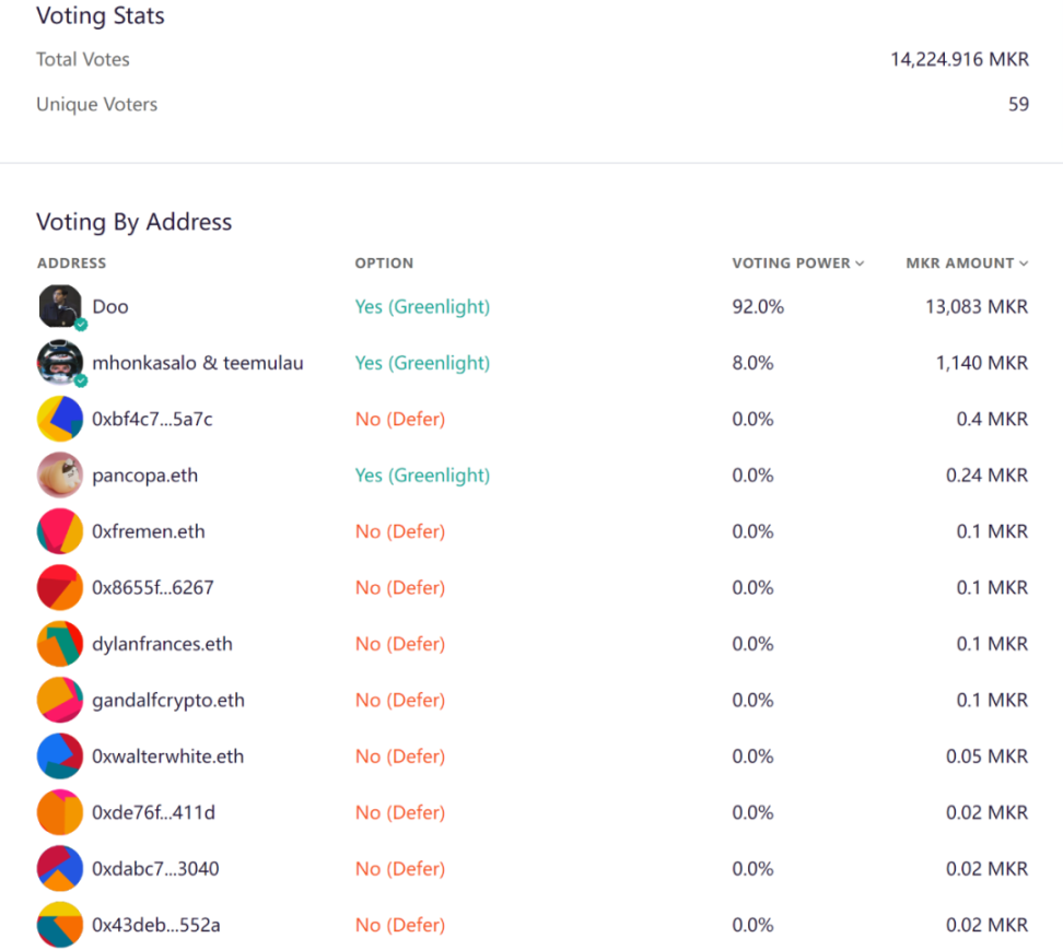 我们可以从这个提案中发现一些有趣的现象,真正参与治理投票并且有能够产生影响的人不超过 20 个,且前四名的投票总占比加起来就已经超过了 50% 可以决定提案的通过并对 Maker 协议的内部参数进行修改,甚至在某些投票上,一人就可以起到决定性作用。