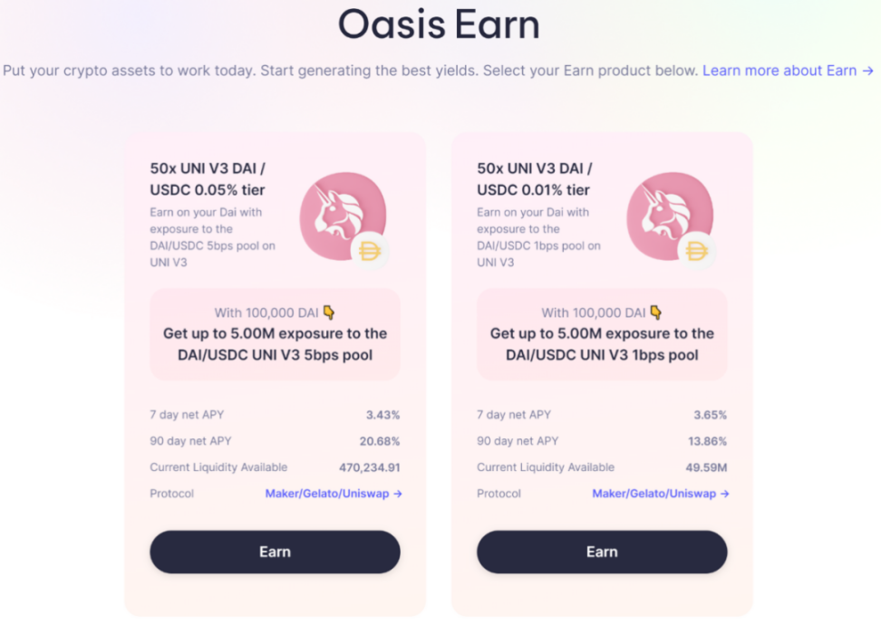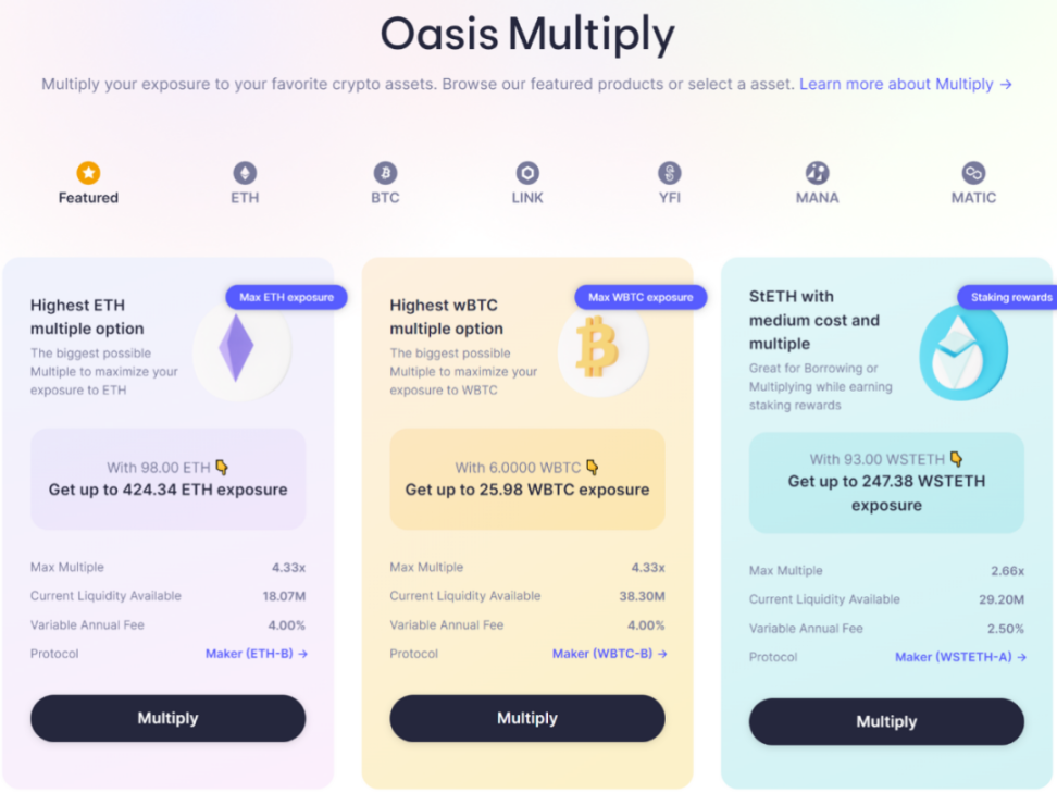 当用户创立一个保险箱(Vault)后,用户可以在 Oasis.app 上通过 Oasis Multiply 功能支付由 MRK 持有人指定的利息来借入 DAI 在保险箱中(Vault)购买更多的抵押头寸,这使得用户可以在抵押资产价值上升中获取更多的收益,但同时在面临资产下降时也会面临更高的清算风险。
