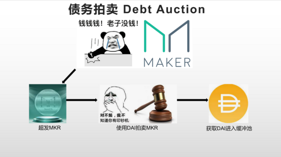 债务拍卖(Debt Auction)机制:当缓冲池中的 DAI 不足以偿还 Maker 债务时,Maker 协议将会超发 MKR 来启动拍卖程序,拍卖者可以使用 DAI 拍卖获取 MKR,拍卖获取的 DAI 将进入缓冲池去偿还债务。