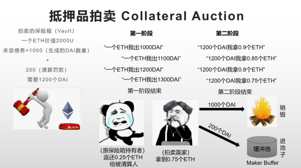 担保品拍卖(Collateral Auction):在第一阶段担保品拍卖中,竞价者开始对拍卖的抵押品出价,最高价者支付 DAI 来低价获取抵押品,回购的 DAI 用来弥补金库的未偿债务及清算罚金。