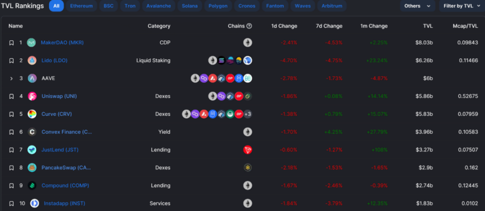 MakerDAO 是一个运行在以太坊区块链上的、集超额抵押稳定币、借贷、存储、用户共同治理和发展的项目,MakerDAO 最核心的就是 Maker 协议,又称多担保 DAI(MCD)系统,可以让用户使用经过协议批准的资产作为担保物来生成去中心化稳定币 DAI,截止至 2022 年 7 月 26 日,MakerDAO TVL 为 $8.03B 稳坐 DeFi 王者宝座。