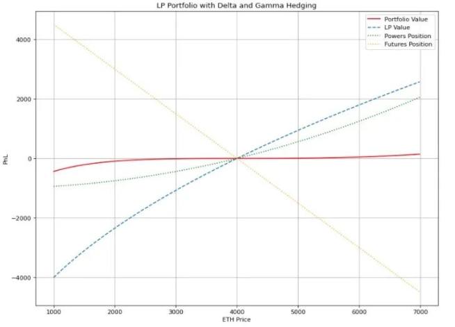 假设LP的初始流动性是1 ETH:4000 USDC,那么用w个单位的ETH²和z个单位的ETHUSD期货构成的组合,就能获得远比价格波动50%更加平坦的价格保护。