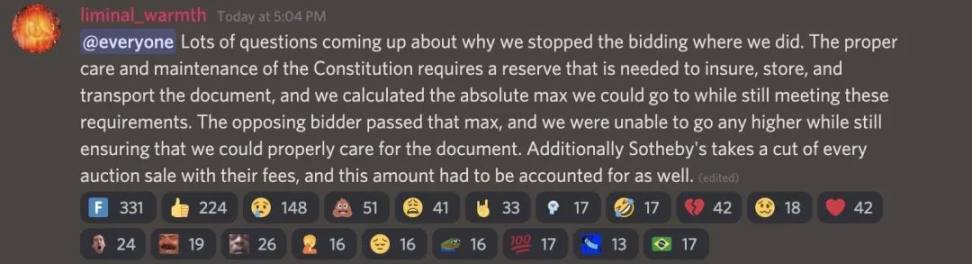 但由于链上数据透明可查,Constitution DAO 基本属于明牌竞拍,在竞拍价超过 4000w 美元时 Constitution DAO 选择了放弃,因为剩下的金额不足以去承担文件保管费等,最终该副本以 4300 w 美元成交。之后 Constitution DAO 开启了退款通道,并宣布所有权力交给社区,停止运营;这场载入史册的实验最终也走到了尽头。