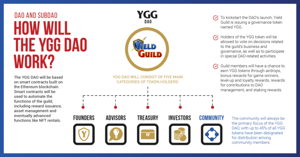 YGG DAO 是游戏公会 Yield Guild Game(YGG)建立的一个由玩家和投资者组成的 DAO,通过投资 GameFi 及 NFT 获利。