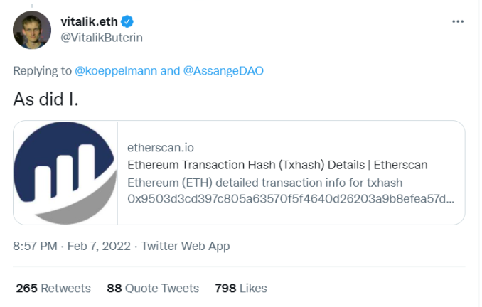 AssangeDAO 成立的目的是恢复 Julian Assange 的自由,即需筹集资金为其进行法律辩护和支持。短时间内 AssangeDAO 募资近 17000 枚 ETH,且由于 Assange 的弟弟(同父异母)站台,所以没人质疑真实性(V 神也进行了捐款支持)。