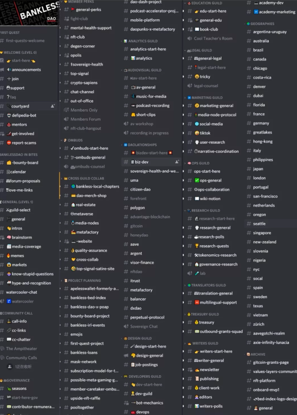 随着发展,BanklessDAO 具备了写作、财务、翻译、研究、运营、市场、法律、教育、设计、商务、开发、视频、数据分析在内的 13 个子工会,Discord 设立了 200 多 个频道,吸引了超过 27000 名用户。