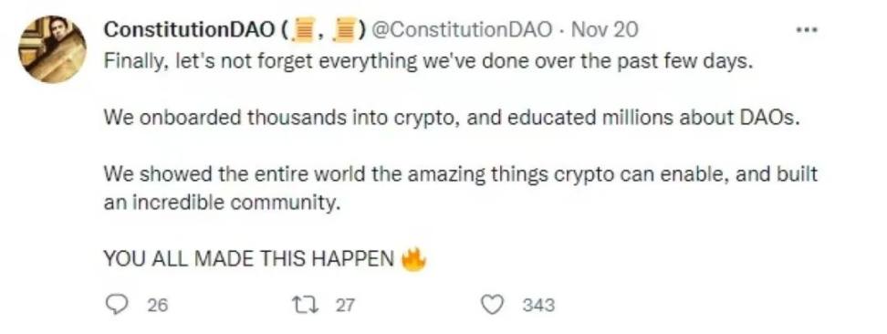 正如官方声明中表示:「这是一个里程碑式的事件,向全世界展示了一群普通人可以利用 Web3 的力量去面对一个看似不可逾越的目标,在不可能的时间线上取得令人难以置信的成果。我们真诚地希望 Constitution DAO 能够激发许多其他人的灵感,利用 Web3 的力量对世界产生积极影响。」