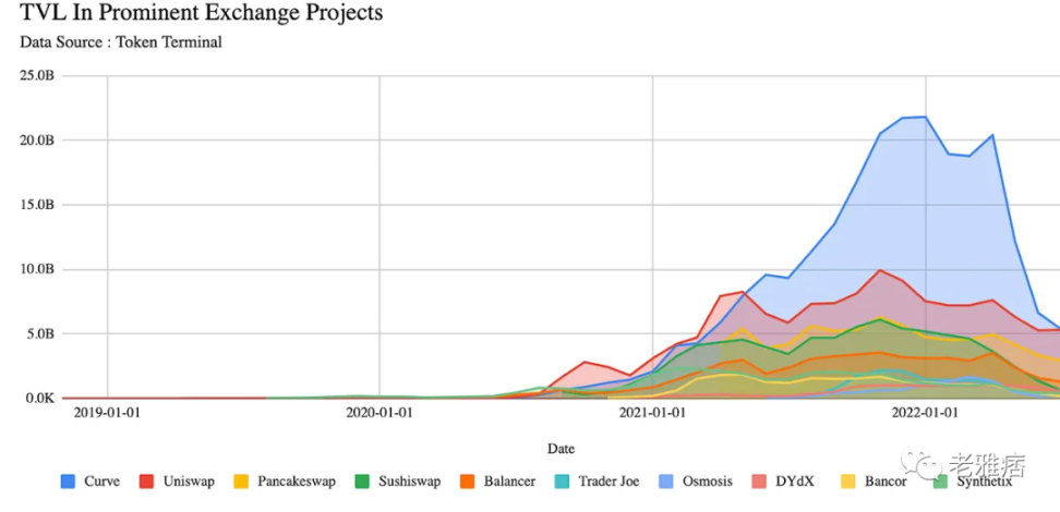 ▵ Curve、Uniswap 和 Pancakeswap 于早期阶段进入 AMM 领域,可以比后来的同行获得更高的 TVL。