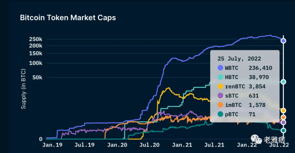 你可以找到一种方法将基础资产 ( 比特币 ) 转移到所有操作发生的地方。打包资产成为了比特币持有者与 Aave 和 Compound 等互动的同时,获得可以兑换实际比特币的 IOU 代币的一种方式。这让用户能够了解以太坊带来的金融可能性。仅 WBTC 中就有超 23.7 万个比特币,这明显领先于以太坊上的打包比特币。