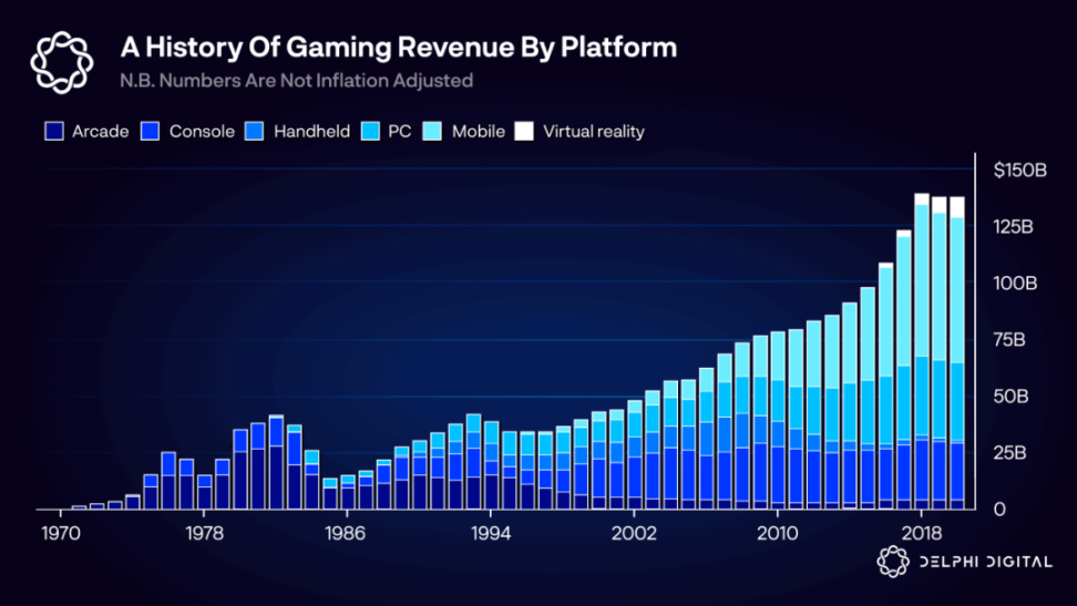 在我们探索加密货币在游戏中的当前化身之前,有必要在上面提供的背景下思考行业的发展历程。自 1970 年代后期以来,电子游戏行业作为一种主流现象一直处于漫长的演变过程中,当时街机游戏引领了游戏的第一个黄金时代(1978-1982)。这些早期的游戏散发着灵魂,街机的公共奇观首次释放了游戏产业的强大竞争力。对高分老虎机的追求以及随之而来的可以在朋友和敌人面前炫耀的荣耀是有感染力的。这些游戏技巧娴熟、有趣,并遵循古老的格言,即伟大的游戏应该易于学习,难以掌握. 鉴于现代电子游戏看似无处不在的性质,早期的收入与最近的收入相媲美似乎违反直觉。1981 年,电子游戏行业的收入为200 亿美元。经通货膨胀调整后接近于当下的 640 亿美元。就上下文而言,2021 年的全球游戏收入为 1800 亿美元。尽管当时与游戏相关的摩擦,电子游戏的成功令人印象深刻。从不得不随身携带硬币、在混乱中排队等候、确保机器正常运转、确保游戏正常运行——这对现代游戏玩家来说都是无法忍受的。那么除了新奇之外,这些早期游戏背后的魔力是什么?Brooks Brown 在谈到 NOR 时,强调“公平竞争和冒险的快感”的理念。核心理念是,在早期,游戏提供了真正的风险。走到街机的前排后,0.25 美分会给你一次三条生命的游玩机会。如果你消耗完三条生命,你就得出局。随着美元价值与技能交织在一起,让玩家不断提升技能有真正的动机。更优秀的玩家可以活得更久,因此他们的钱确实物有所值。最伟大的玩家以高分形式获得最高级别的激励,他们的成就可以永垂不朽——每个人都知道在记分板上获得一个位置的难度,因此它值得尊重。激励结构驱使玩家想要通过更多练习来变得更好,而这只能通过花费更多来实现。重要的是,游戏的公平性也是神圣不可侵犯的。没有作弊码、可购买的强化道具或其他消耗品来给玩家带来优势。这些游戏是原始的竞争形式,除了环境之外的所有变量都在玩家的控制范围内。与我们在现代看到的许多情况不同,用户可以保证他们可以仅凭纯技巧赢得这些游戏。这也是 Brooks 所言的“公平竞争和冒险的快感”。随着行业的发展,家用游戏机的出现让玩家退出了街机游戏,回到了自己舒适的家中。他们现在可以随时随地玩任何他们想要的游戏,没有限制。在掌机兴起和互联网出现之间的几年间,街机的公众奇观和围绕高分的竞争精神逐渐减弱。以前这些顶尖的“虚拟玩家”曾俘获过大批观众,但现在这种能量已经消散了。失去所有三条生命和“死亡”并不具有相同的含义,因为玩家可以简单地免费重生而不会受到任何现实世界的惩罚。因为输球没那么重要,赢球也不重要。行动的后果已经改变。正如 Brooks 所说,“风险贬值切断了球员技能和娱乐价值之间的联系”。最终,游戏设计师变得更加依赖技术进步,例如更好的图形和声音,以分散用户对这种微妙但重要的变化的注意力。今后,从舒适的家中无限重生的永恒循环将是常态。NOR 以前的名字实际上是 Eternal Return,以尼采的注定要如此重复存在的宿命论命名。到 1980 年代中期,电子游戏发展迅速,制作预算不断增加,制作出更大的游戏,其中包含越来越复杂的机制以及更长的故事情节。该行业不再与体育直接竞争,而是倾向于与电影和电视竞争。几十年过去了,我们看到了这种向更高产值游戏全面发展的趋势,2019 年第四季度 Netflix 投资者信中指出“我们与《堡垒之夜》的竞争(并输给)比 HBO 更多”。在 80 年代、90 年代和 00 年代,该行业由高级 AAA 游戏主导——要玩这些游戏你必须支付大量前期成本,通常为 60 美元。这些游戏通过 CD 或盒式磁带分发,并在 PC 或 Playstation 或 Nintendo GameBoy Advance 等游戏机上运行。这些游戏的存在依赖于愿意支付“热情溢价”并在每周工作 100 小时后睡在办公桌下的开发人员。“高级游戏”商业模式意味着只有 (1) 拥有必备硬件(家用机或 PC)并且 (2) 有 60 美元可用于个人游戏体验的玩家,才能玩这些电子游戏。虽然这些体验很珍贵,但全球电子游戏的可访问性有限——2001 年,最畅销的电子游戏:《口袋妖怪金 / 银 / 水晶》仅售出 310 万份。相比之下,Garena: Free Fire 的用户数超过 100 倍,如今每月有 311,250,355 名活跃用户 。此外,游戏开发商的价值捕获是有限的——无法有效地进行价格区分,这意味着愿意为游戏体验支付数千美元的玩家没有任何有意义的方式去花费这笔钱。随着免费游戏和手机游戏的出现,这种情况发生了显著变化。手机游戏和免费游戏模式将游戏业务推向了令人眼花缭乱的新高度。如今,手机游戏收入($850 亿 ) 的收入超过了 PC ($400 亿 ) 和主机游戏 ($330 亿 ) 的总和。凭借数字优先游戏的巨大发行优势,该行业倾向于让游戏免费开始。这向全球超过 30 亿人开放了游戏。虽然游戏是免费启动的,但游戏仍然必须通过变现才能获得资金。移动时代导致了两种主要策略:广告,以及最有争议的微交易——其中包括向人们收取额外费用,以及这些游戏中的优势:便捷性、时间…以及相对于其他玩家的权力。虽然这开始时是无害的,因为大多数变现都发生在皮肤和其他不影响平衡的购买上,但在许多情况下它已经转移了。游戏的设计和开发是出于行为主义而非滑稽视角的考虑。使游戏成为风险投资支持行业的方法意味着一场逐底竞争。通过专注于提高