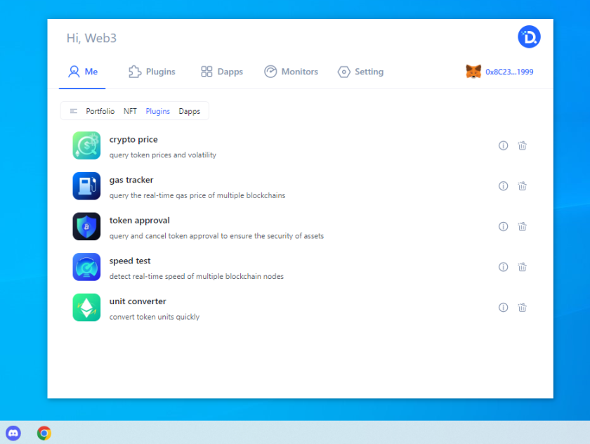 Dtools (Decentralized Tools) is the next generation of Web3 ALL-IN-ONE tools. It supports all major operating systems, including MacOS, Windows, iOS, and Android. Including various functional modules and a unique plugin ecosystem based on decentralized technology. We have built a bridge between Web2 and Web3.