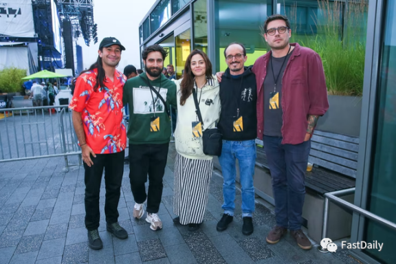 从左到右:Zeshan Ali (Sass), Kerem Atalay (Emperor Tomato Ketchup), Nicole Muniz (Yuga Labs CEO), Solano, and Aronow 在纽约的 ApeFest 2022Matteo Prandoni/Courtesy Yuga Labs。