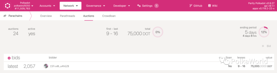 Polkadot 第 24 次平行链插槽 Auction 在 8 月 5 日晚 21:00 左右启动。目前 匿名 ID 2057 进行了直接出价,且出价最高。同时活跃的 Crowdloan 还有 Kylin 和 OmniBTC。https://polkadot.js.org/apps/?rpc=wss%3A%2F%2Frpc.polkadot.io#/parachains/crowdloan