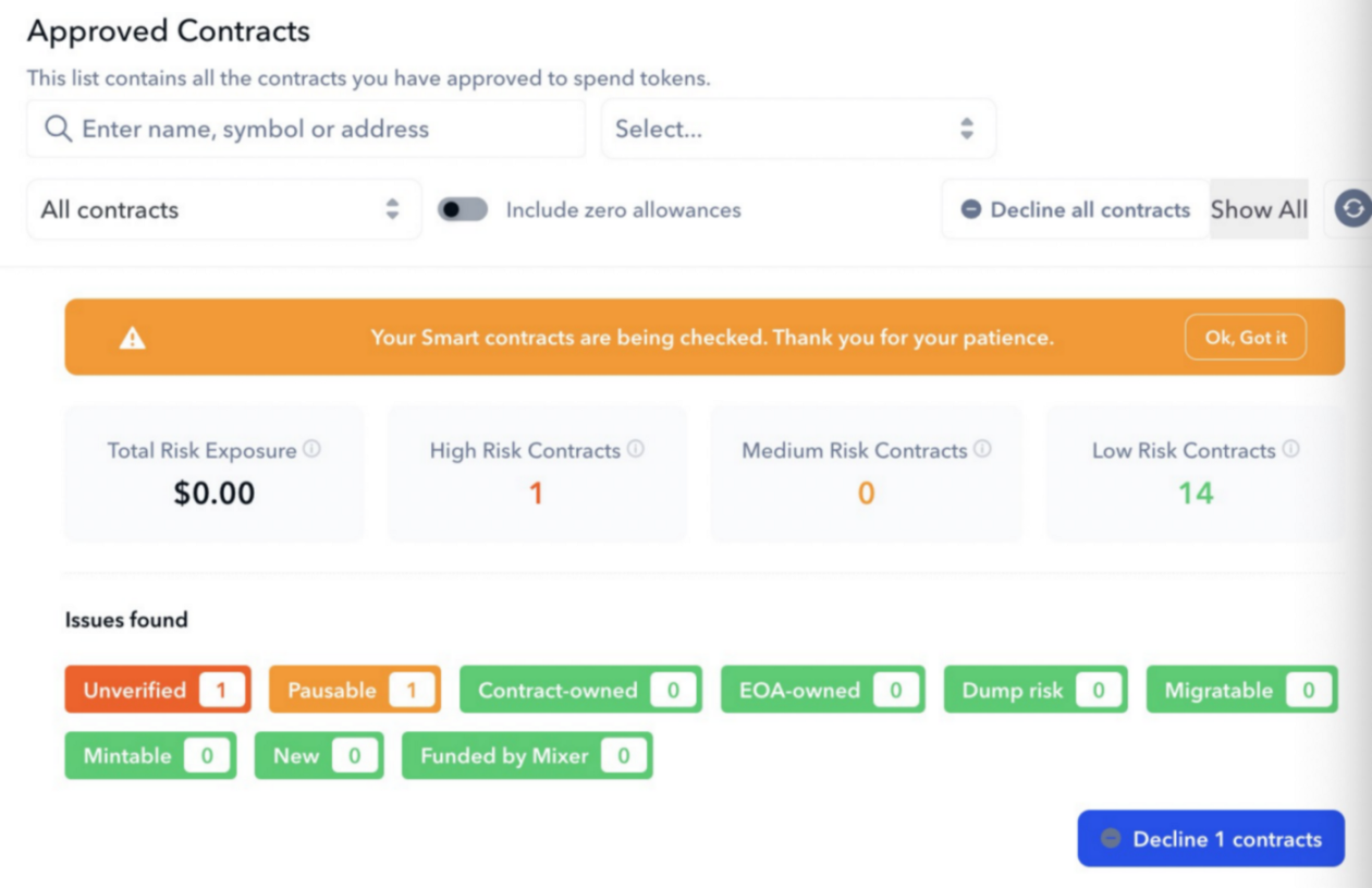 As for security protection, DeFiYield lists the protocols and tokens authorized by your wallet, as well as the corresponding risk level. Through automatic risk analysis, the application provides different risk levels (low risk, medium risk, and high risk) of smart contracts on different protocols. Moreover, DeFiYield warns you which of the authorized agreements might pull the rug or do evil. This way, you will become more concerned with such security issues and promptly withdraw your authorization of the risky projects, thereby protecting your assets. Apart from this, DeFiYield is developing a fully-automated, highly-efficient, and accurate smart contract scanner, which enables anyone interested in DeFi investments to carry out comprehensive analyses of any smart contract deployed on Ethereum or Binance with just a few clicks.