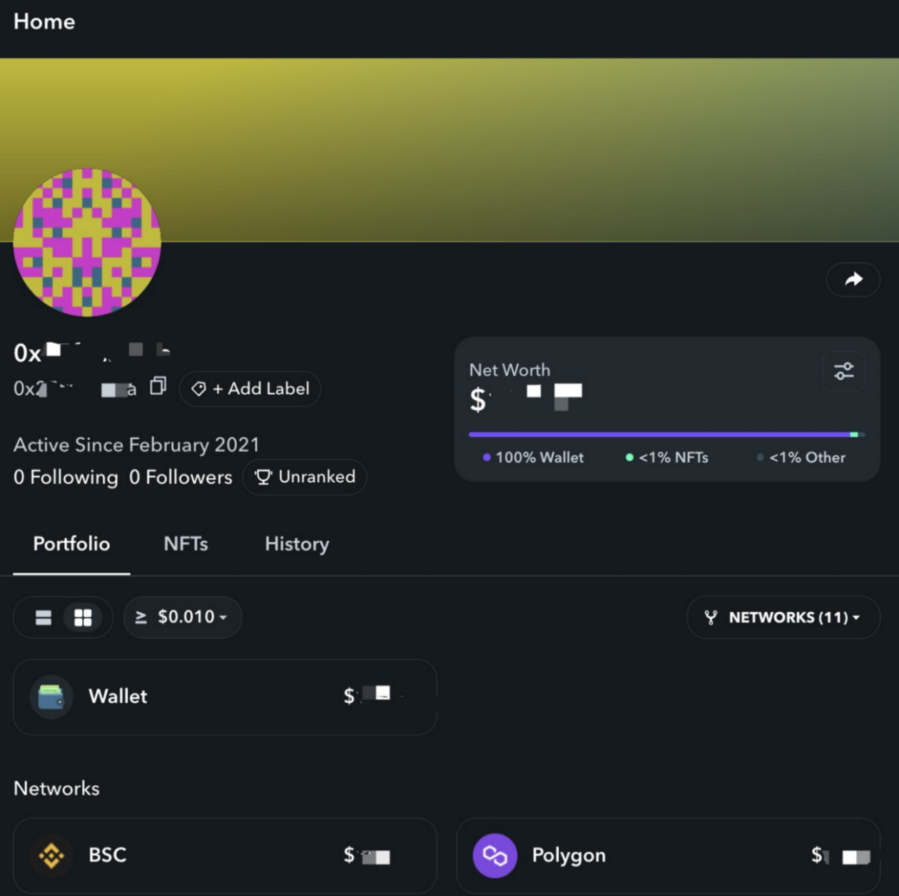 Zapper’s dashboard offers a clear overview of your asset distribution, featuring categories including Portfolio, NFTs, and History. In Portfolio, the asset balance of different classes (protocol, public chain, and NFT) is directly available. Moreover, you can personalize the way information is displayed on Zapper. For example, you can ask the application to only show assets with an asset balance higher than a certain figure. When it comes to NFTs, Zapper supports Ethereum NFTs and shows your NFT holdings and their estimated value. What is interesting is that you can use one of your NFTs as the background/banner of the dashboard homepage or your Zapper avatar, which helps you attract more followers.