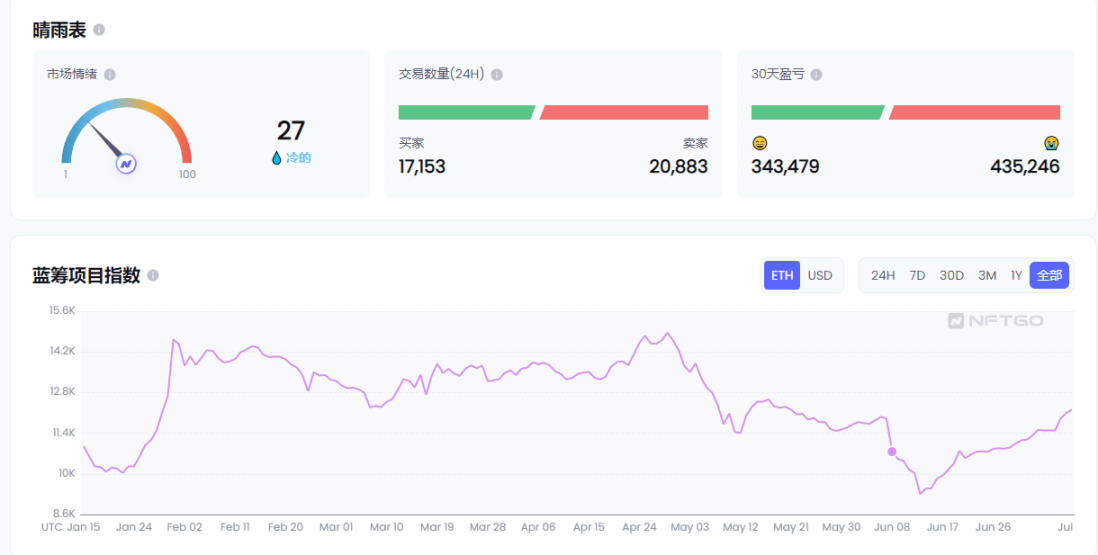 NFTGO 在 NFT 数据总览上给出较为详细的数据,包括晴雨表、蓝筹项目指数、市值&交易额、持有者 & 交易者、总市值以及项目分布等。