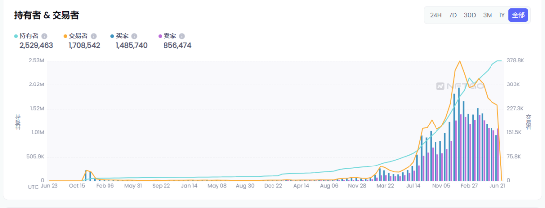 在持有者 & 交易者板块数据中,NFT 持有者增加的速度,从最初的速率逐渐增加到几个月前,逐渐放缓,意味着市场的 NFT 新增项目正在受市场影响逐渐变少(资本市场投资行为下降),但是市场仍旧存在 NFT 资产的持续发行行为。而从买家、卖家以及成交者板块看,买家的数量在呈现下降趋势,卖家的数量则有所反弹,同时成交者(存在买卖行为的投资者)的数量则呈现断崖式下跌(7 月 10 日的统计数据不完全)。所以这意味着,市场的购买力在下降,越来越多的人在倾向于出售他们手中的 NFT,并且市场中 NFT 的流动性较差,交易匹配率并不高(比如此前,市场行情好的时候,买家的活性远远大于卖家,因为他们更加对市场抱有信心)。