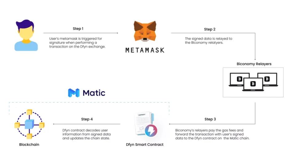 Dfyn 是一个 AMM DEX。Dfyn 的特色主要是无 gas fee 交易功能,未来跨链 Swap 的功能,多链支持 (Arbitrum,Polygon…),和可定制化的 Toolkit。我们着重来看一下无 gas fee 交易以及跨链 Swap 的特点。