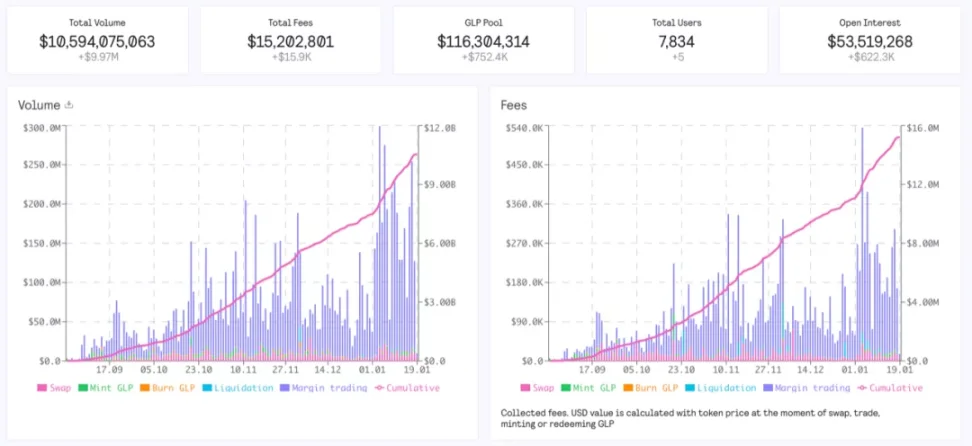 GMX 的 GLP 设计以及池子的深度保证了无滑点的交易,GMX 的质押设计保证了持币者长期的持币。GMX 的总交易量以及总手续费在良好的代币系统设计下飞速上升。Arbitrum 在 GMX 这里起到的作用主要就是保证手续费够低,保证了去中心化合约交易所的可行性。