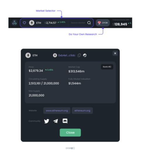 而顶部带有蘑菇标志的页面,展开就是当前代币的详细情况。DYOR(自己研究的意思),就很形象。知名的代币也会内置社区链接,相当的人性化。