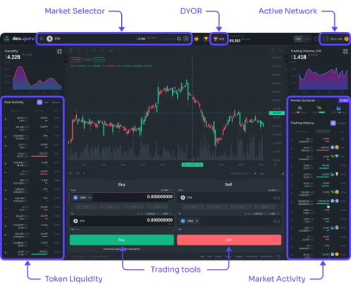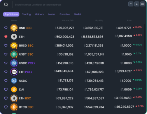 是一款 DEX 聚合平台和工具,对 AMM DEX 未来发生的事情了若指掌,提供了去中心化交易集成,实时同步链上市场的情况。Dexguru 将每个 DEX 市场的无需许可的实时数据、链上研究、强大的分析和交易执行功能整合到一个完全集成的 UI 中。