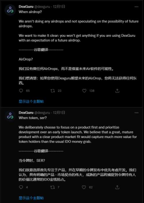 官方推特也发不了类似于 DYDX 的否认推文。大概意思就是我们现在没有计划空投,但以后会不会就不知道了。所以,相对来说,可能条件会有所限制。所以将 DEX.Guru 做为日常交易的 DEX 又有何不可?
