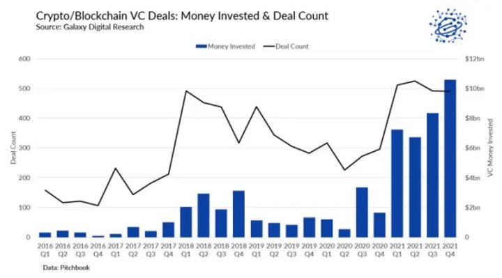 最大的机构通常将其投资组合的几个百分点分配给风险投资。 超过 10 亿美元的捐赠基金平均分配 11%。 2017 年,风险资本家对加密货币的投资甚至还不到 10 亿美元。 2021 年,该行业仅在第四季度就增加了 11 倍。
