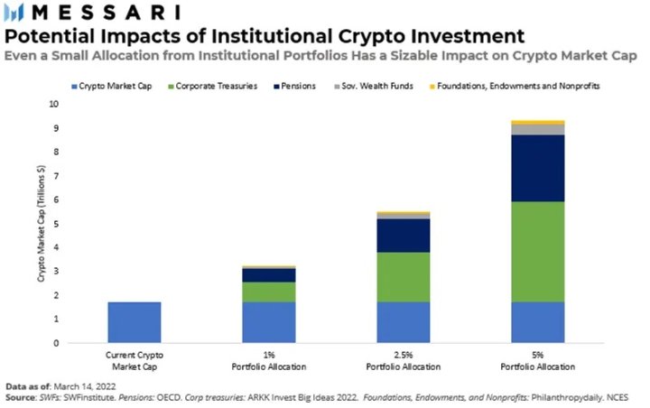 有迹象表明市场情绪正在发生变化。利息和交易量上升。一路攀升。 2021 年,机构投资者仅通过 Coinbase 就交易了价值 1.14 万亿美元的加密货币,是 2020 年的 10 倍。一份报告估计,现在有多达 80% 的机构被允许分配给加密货币。据 Fidelity 称,70% 的机构投资者计划在不久的将来购买数字资产,而 Nickel Digital Asset Management 的一项调查显示,这一比例接近 80%。理解导致行动。