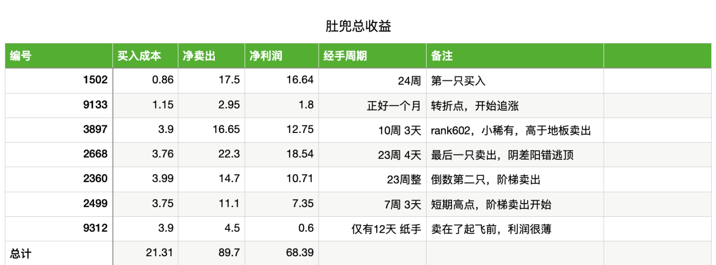 最后一只出掉的稀有款,rank329,我一直挂 40E 左右,因为女性角色流动性并不是太高,一直没卖出去。最后卖掉,实属因为运气,赶上创始人自曝黑历史的前夜,好心人以 29E 的高价 offer,我想了 5 分钟,考虑到流动性问题,就接受了 offer,占用了将近 15 周的流动性,翻倍获利卖出。 (想想也是惊悚,万幸,要啥自行车啊,谢谢好心人!)