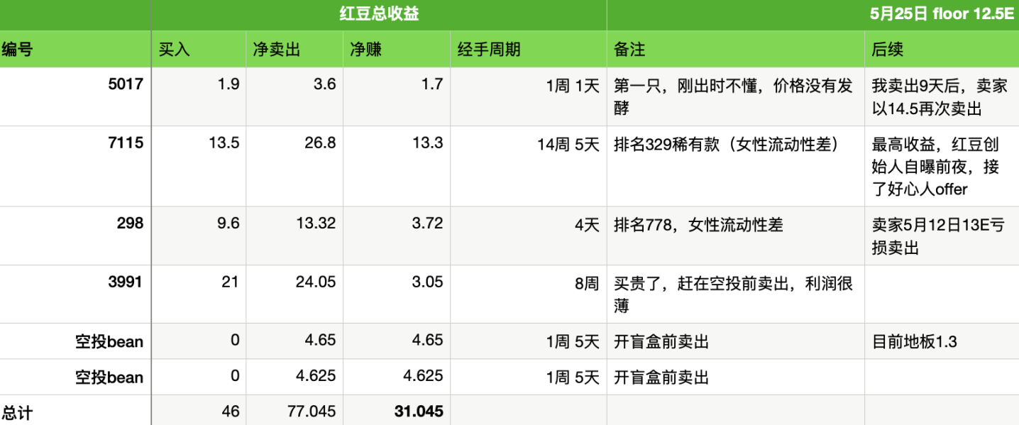 红豆这波,说实话没赚到钱,不过还好都是 flip,没有发生赔本卖的情况。前 3 只的净利润还不及 2 只空投盒子赚的钱,原因是:买的第一只没看太懂,也不太喜欢,就超级纸手,虽然成本很低,8 天时间卖出,但是遗憾没有赶上主升浪;另外两只成本过高,尤其是 21E 的那只 fomo 情绪明显,后来发现属性其实一般就一直挂着等人买,在空投之前三四天卖出,少拿了 2 个盒子。
