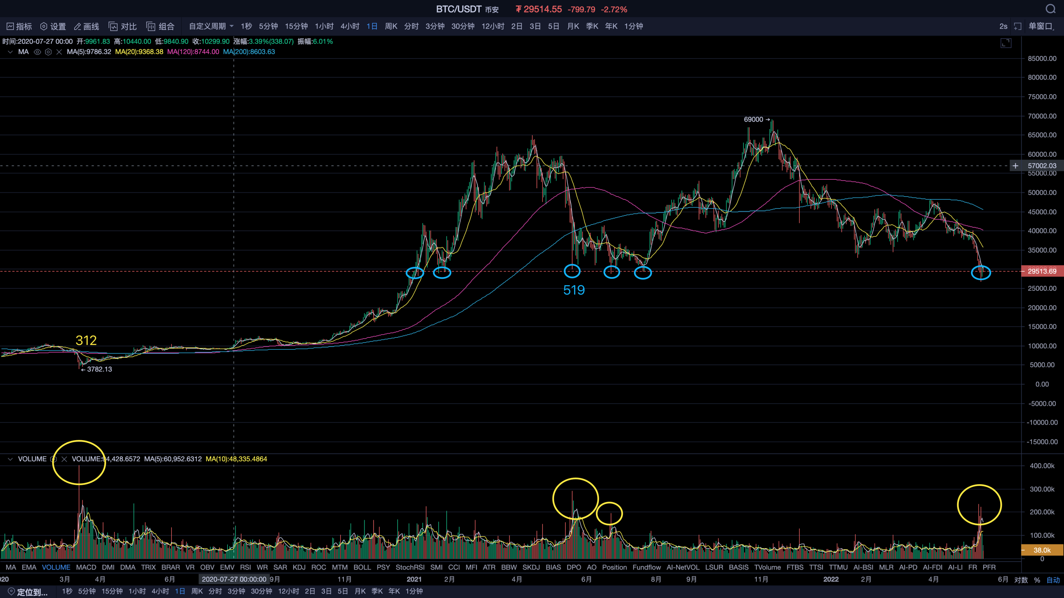 1 前五次都是一个阶段性底部;2 距离 519 也正好将近一年;3 519 后,短期又在 6 月末和 7 月末再次踩入,之后才企稳回升;4 要是刻 519 的话,这里也应该来回震荡洗盘一两个月了,所以别着急抄底,尤其山寨币,更别开合 / 约。不过,去年 519 是牛市,是大水漫灌流动性充足的时候。然而今年的宏观环境我已经不用再说了。5 要是刻 2018 的话,嗯。。加息四次,纳指从 9 月末到年底,从最高点回调 25% 进入技术性熊市…不过在 2019 年用了半年的时间再创新高,在 2020 年疫情放水后回看那段,已然是一次小回调。6 看底下的交易量,这次也是既 312,和 519 之后第三高的了 7 312,519 都是黑天鹅,这次 luna 事件同样是黑天鹅 8 黑天鹅 is the ladder (😂)9 留得青山在 不怕没 10 倍 10 先别进场外资金吧 11 6 月还有缩表,没忘吧