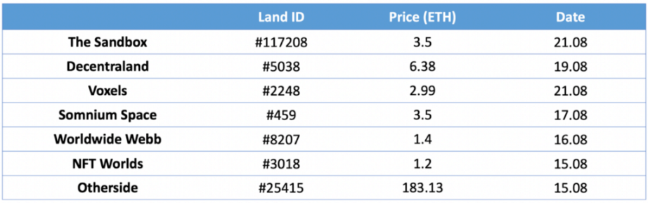 尽管 6.38ETH 的最高成交价和 The Sandbox 相比很不错,但这笔交易的标的是一个庄园,而这一成交价是今年以来最低的 7 日 Top Sale。当 $MANA 和 ETH 分别下跌 20.5% 和 18.5% 时,一周内土地均价上涨 1.22%,这也并不是一个令人振奋的局面。