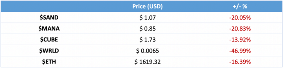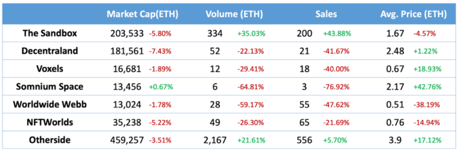 The Sandbox 的 7 日销量环比增涨 44%,但其均价下降了 4.6%,最高成交价仅为 3.5ETH。表面现象可能具有一定的欺骗性。The Sandbox 在推动名人进入该领域和赢得 $SAND 的比赛中继续前进,然而,我们对于下周推出的 Alpha Season 3 是否能扭转 LAND 销售的现状依旧持观望态度。$SAND(-20%)和 $ETH(-18.5%)的价格在本周大幅下跌。