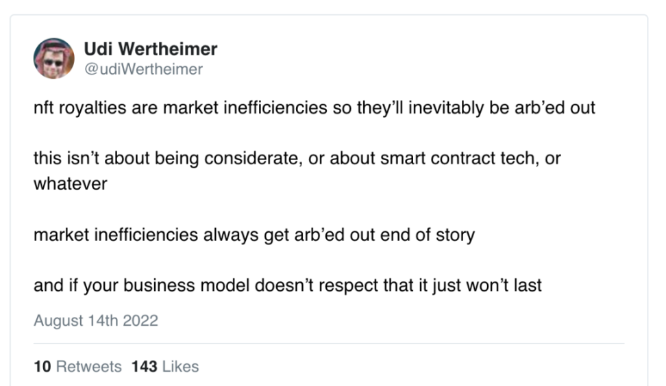 另一些人认为,对于这场向零版税的竞赛如何几乎不可避免,无论你喜欢还是讨厌它,你都有更多愤世嫉俗的看法,正如最近的 Udi Wertheimer 推文所代表的那样: