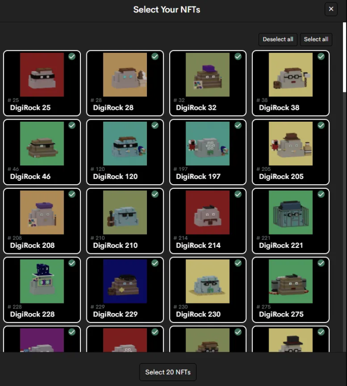 7. 在随后的页面上,单击“选择您的 NFT+”(Select Your NFTs+)按钮,然后通过并选择您要存入的 NFT,如下所示: