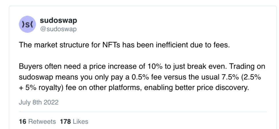 买家通常需要涨价 10% 才能达到收支平衡。在 sudoswap 上交易意味着您只需支付 0.5% 的费用,而在其他平台上通常需要支付 7.5%(2.5% + 5% 版税)费用,从而更好地发现价格。