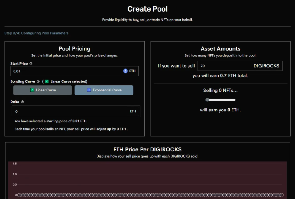 6. 在这个阶段,你可以设置你的 NFT 的价格点、它的联合曲线类型,以及它的价格在新交易时变化的增量。再次单击“下一步”按钮。
