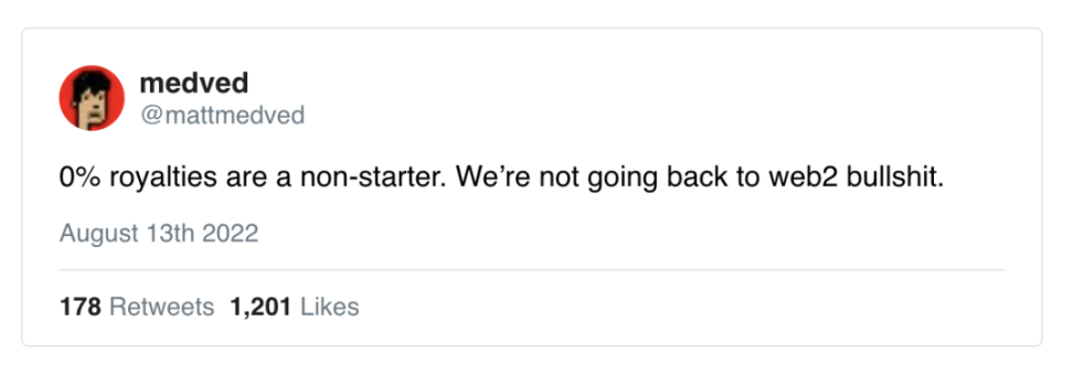 因此,在 NFT 生态系统中的大部分老牌守护者中都有一种非常强烈的支持版税的文化,而且这个阵营中的许多人认为,零版税(如 Sudoswap)是一种倒退、一种剥削、一条不可逾越的红线。