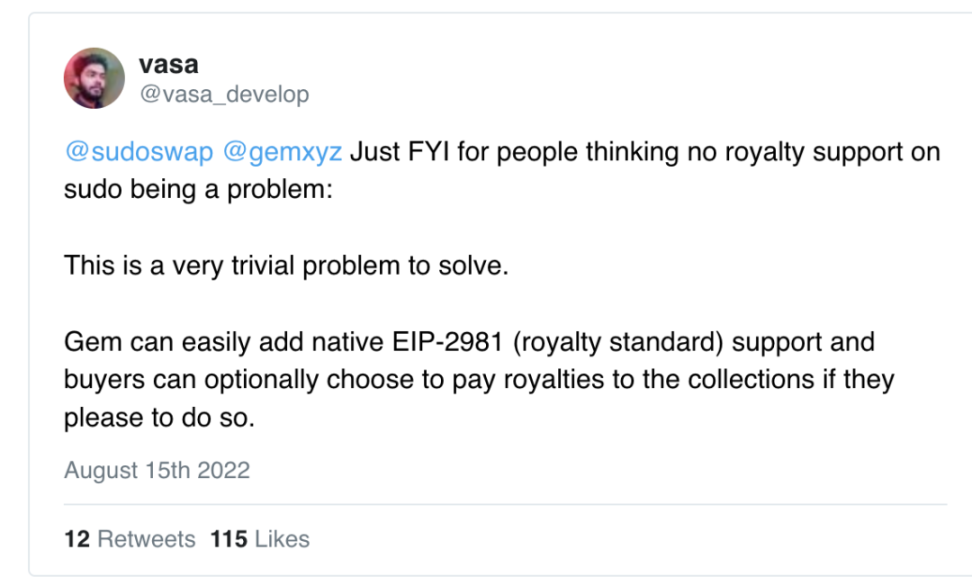 对于那些认为 sudoswap 没有版税支持是一个问题的人:这是一个非常微不足道的问题。Gem 可以轻松添加原生 EIP-2981(版税标准)支持,并且买家可以根据需要选择向收藏品支付版税。