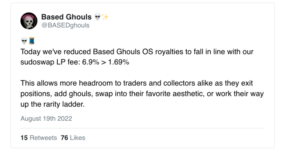 今天,我们降低了 Based Ghouls OS 版税以符合我们的 sudoswap LP 费用:6.9% > 1.69%