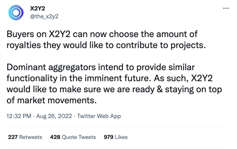 NFT 交易平台 X2Y2 于 8 月 26 日发布了一条推特,表示会推出「0 版税」的新功能。文字不多,但引发的争论却着实不小,甚至近期绝大多数 Space 的主题都在围绕「版税」展开。