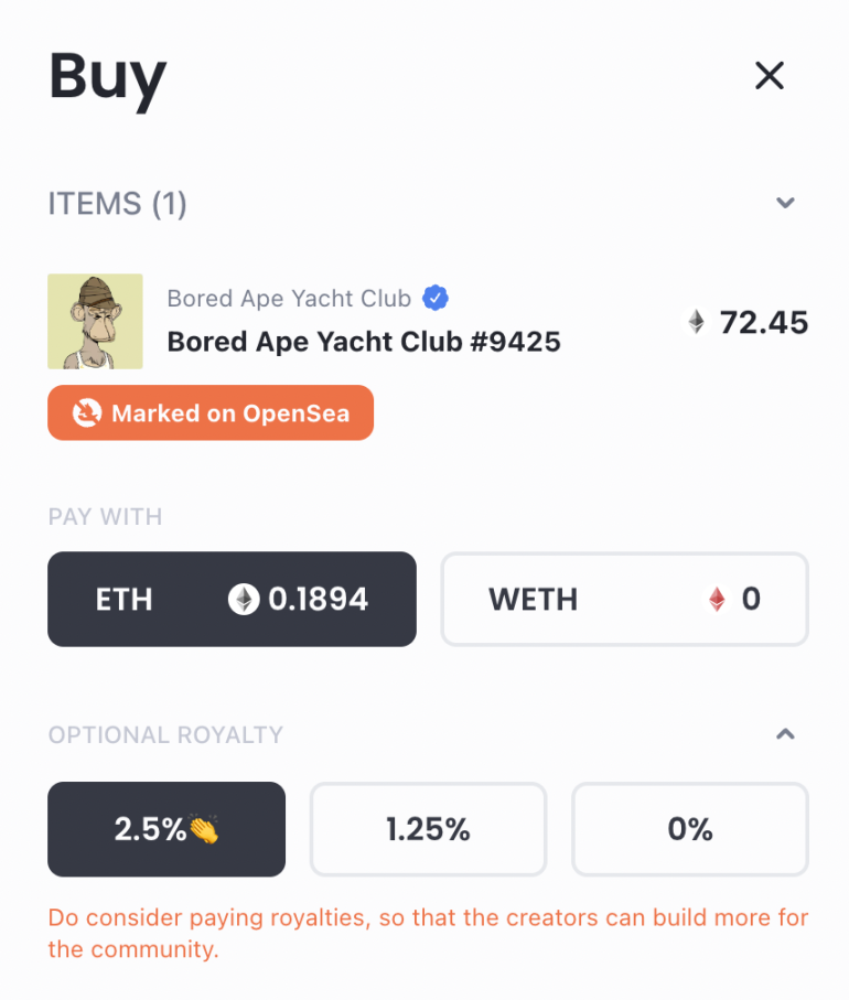 即买家通过 X2Y2 购买时,点击「OPTIONAL ROYALTY」(选择比例的版税)可以自主选择支付多少比例的版税。如,BAYC 正常的版税设置是 2.5%,买家可以选择支付 2.5%(100%)、1.25%(50%)、0%(0%)的版税,而这也会影响到买家最终支付的价格和购买成本。
