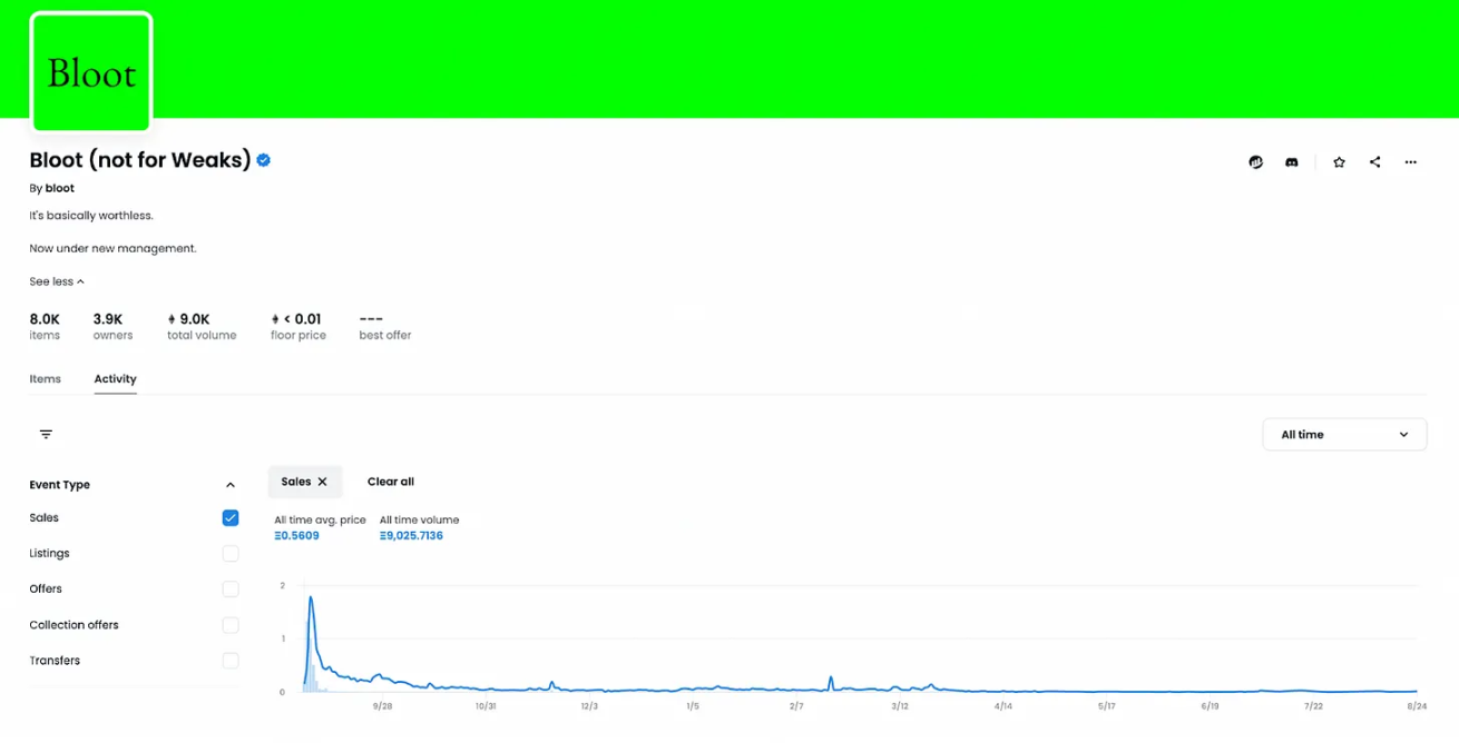Bloot,一个由 Beanie & co. 创建的臭名昭著的 free mint 项目。 尽管总成交量达 9,000 ETH,目前地板价低于 0.01 ETH,这是绝望的税收损失收割机的残留。