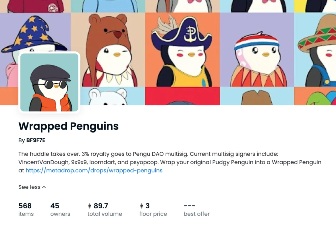 第二个概念是包装合约 (wrapper contracts)。 用一个包装 NFT 系列指向原始 NFT 系列,支持用户通过将原始 NFT 发送给第三方托管来创建包装 NFT。 然后,包装 NFT 是底层资产的影子资产,并且可以不受原始 NFT 创作者在合约中编码的任何限制被自由交易。 请参阅 Wrapped Penguins,这是一个社区对 Cole 出售项目所有权的反抗运动。