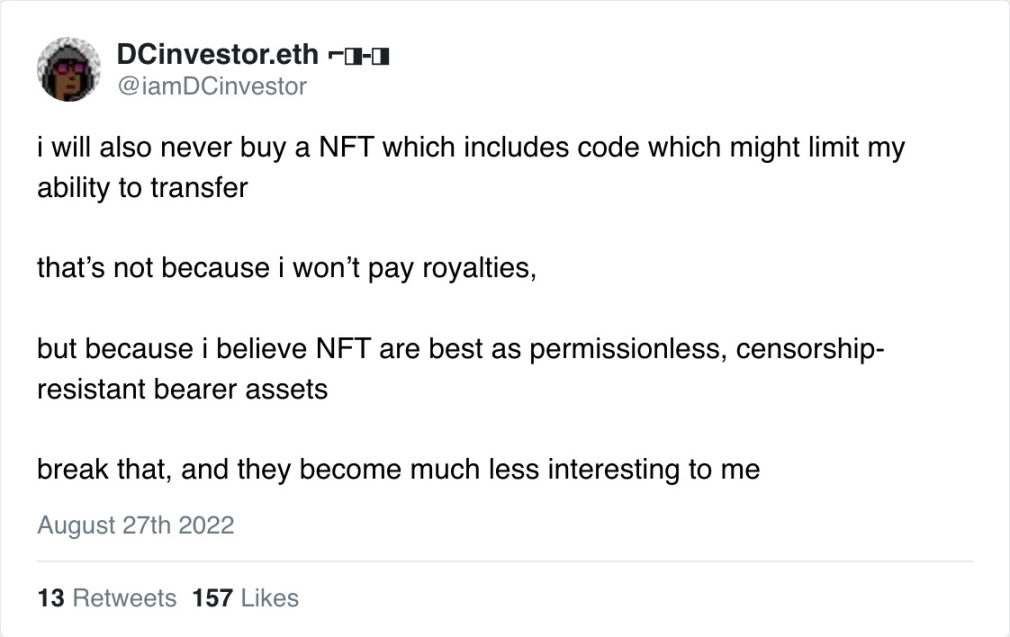 当人们提出「删除钱包到钱包的转账」、「添加中心化黑名单」或「让创作者销毁代币」时,他们已经破坏了 NFT 本身的价值支撑。 没有办法在保持抗审查的同时执行版税。