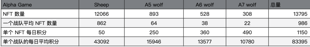 暂时去除 WOOL 质押量和防守攻击行动的不确定性,在 Alpha Game 奖励规则中,一个战队的积分主要由质押「狼」和「羊」的数量,以及「狼」的等级决定。