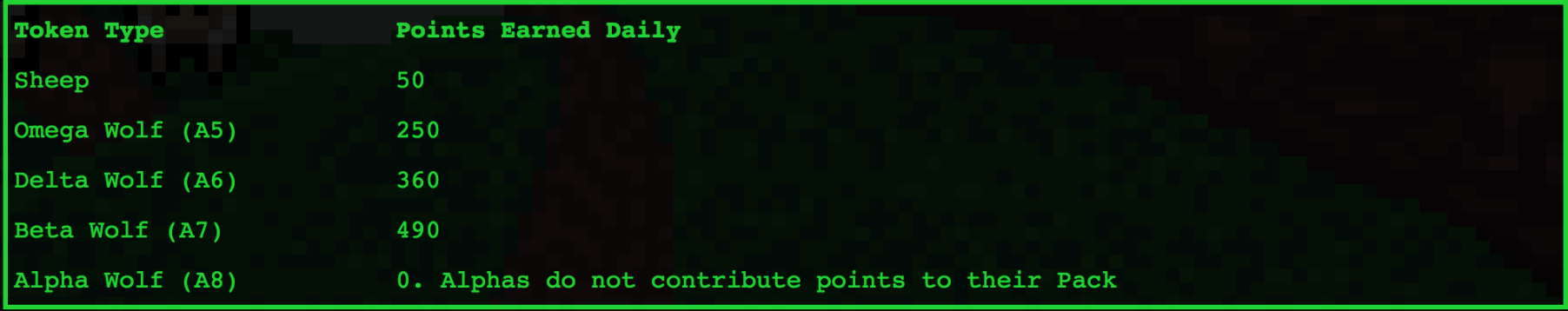 获胜计算方式上,积分最多的战队获得冠军。质押进去的「羊」每日赚取 50 个积分,领头「狼」不能贡献积分,其余「狼」按照 Beta、Delta 和 Omega 等级每日各赚取 490、360 和 250 个积分。