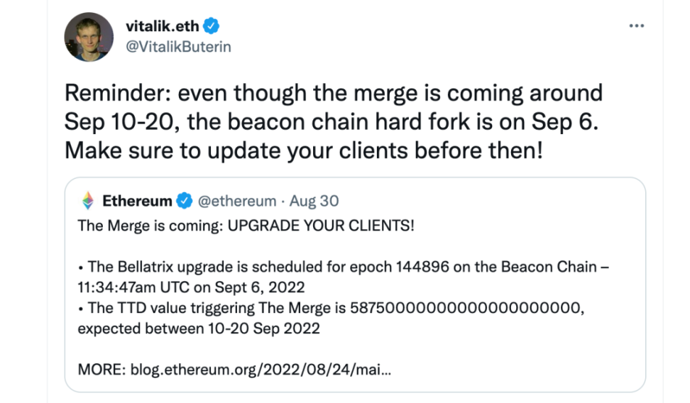 8 月 30 日,V 神在推特提醒社区:以太坊将于 9 月 6 日启动信标链硬分叉,在此之前需要用户(节点运营者)尽快确保客户端升级,以确保在 The Merge 到来后正常运行。什么是硬分叉?最简单的理解就是,网络发生重大变化,节点必须全面升级才能够在新版本网络中继续运行,否则无法同步新网络产生的数据。然而,没有升级的节点依旧会在旧的网络中继续运行,但两个网络已经没有任何互通性。此次以太坊信标链的硬分叉,标志着网络共识从 PoW 全面转向 PoS,即硬分叉后,已升级的节点将会在新的 PoS 共识网络中运行,将可以享受更快的网络速率,因为 PoS 共识在出块权的选择上不需要通过算力计算,仅根据节点“权益”随机给予,可以加速出块的效率以此达到提升网速的目的。然而,对以太坊转为 PoS 共识,有部分人提出了质疑,“安全性”首当其冲——PoS 完全基于“权益”选择记账节点,这会导致“富者恒富,贫者恒贫”的结果,即拥有“权益”越多=记账几率更大=获得收益更多,如此恶性循环更容易导致中心化问题出现。那么,是否可以在 PoS 共识网络速率优势的基础上,整合其它技术优势,来解决这个问题?本体 VBFT 共识机制可以说已经交上了一份优秀的“答卷”。VBFT 是一个结合 PoS、VRF(Verifiable Random Function,随机可验证函数)和 BFT (Byzantine Fault Tolerance,拜占庭容错)的全新共识算法:- PoS 表现为,本体网络的运行依靠共识节点与候选节点运行,节点区分根据在网络中的“权益”数据进行实时更新;