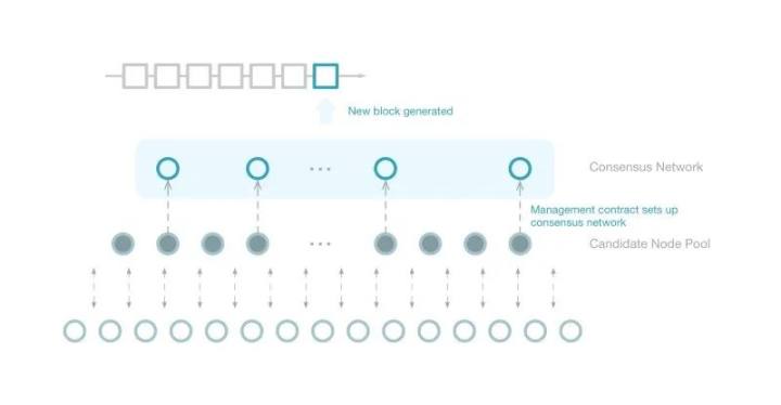 在一轮共识周期中,网络会在节点表中随机选出一组“记账”节点,它们会提供已经打包好、有待验证的区块;